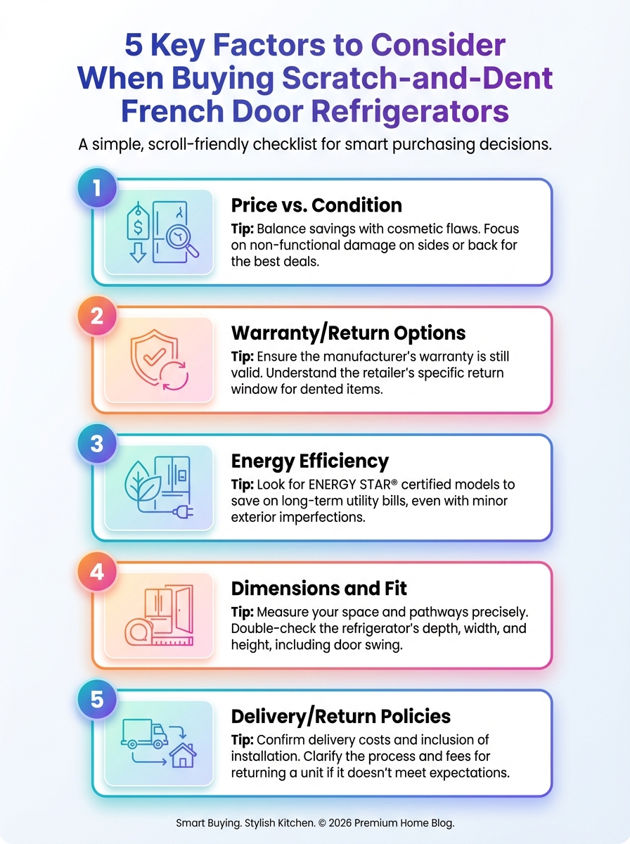We often see 27 cu.ft French door units get 15–30% knocked off for minor cosmetic issues. On a fridge that would normally run in the mid-thousands, that can mean several hundred dollars left in your pocket. Most of the cosmetic damage on this size tends to be on the side panels from shipping and forklifts. Once the unit is slid into a cabinet run, you barely see it, but you still keep the discount.A concise visual guide to the five factors to consider when buying scratch-and-dent French door refrigerators in 2026. It highlights price, condition, energy efficiency, capacity, and warranty.