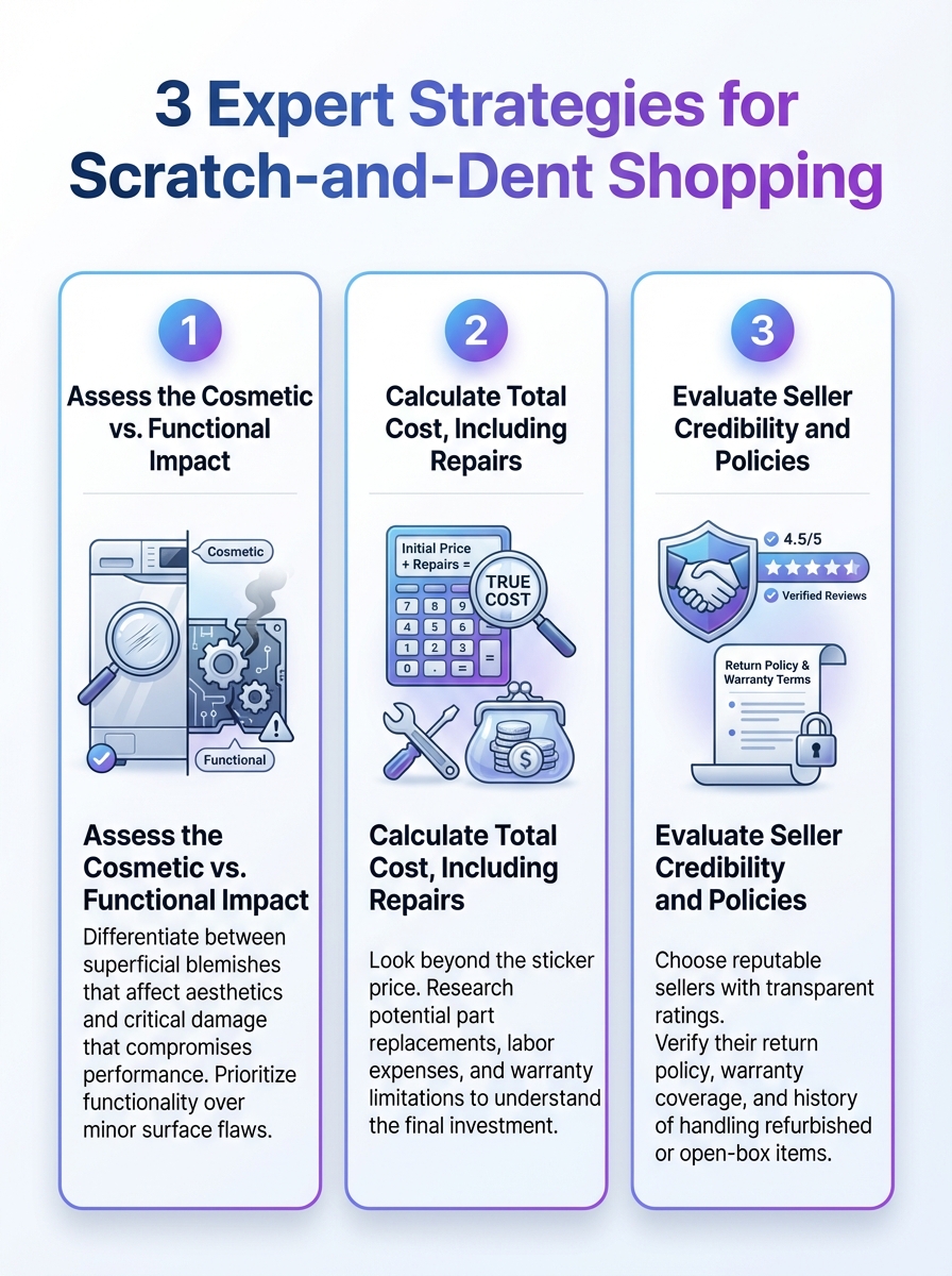 Three expert strategies for scratch-and-dent shopping are summarized in this infographic. Learn practical tips to save money and maximize value.
