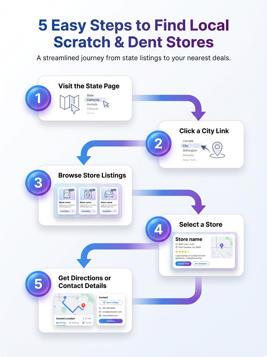 A quick visual guide for finding local scratch and dent stores. Learn the five steps to search smarter and compare nearby options.