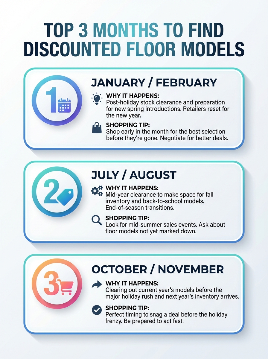 This infographic highlights the top months to find discounted floor models. Plan your next purchase with seasonal timing.
