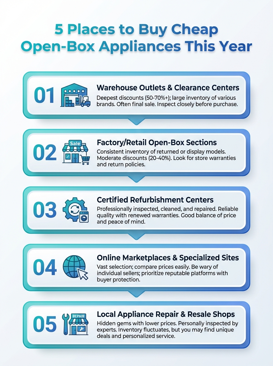 A quick visual guide to where you can snag affordable open-box appliances this year. Discover five trusted places to save on top brands.